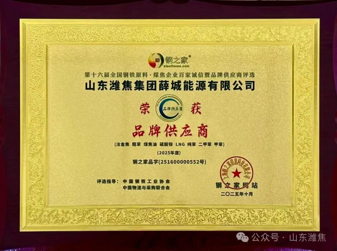 近日,“鋼之家第十六屆全國鋼鐵原料煤焦企業(yè)百家誠信暨品牌供應商”評選活動順利舉行,經鋼之家網站征信取證,中國鋼鐵工業(yè)協(xié)會及中國物流與采購聯(lián)合會專家綜合評審,山東濰焦集團薛城能源有限公司被評為2025年度“品牌供應商”殊榮。榮譽證書